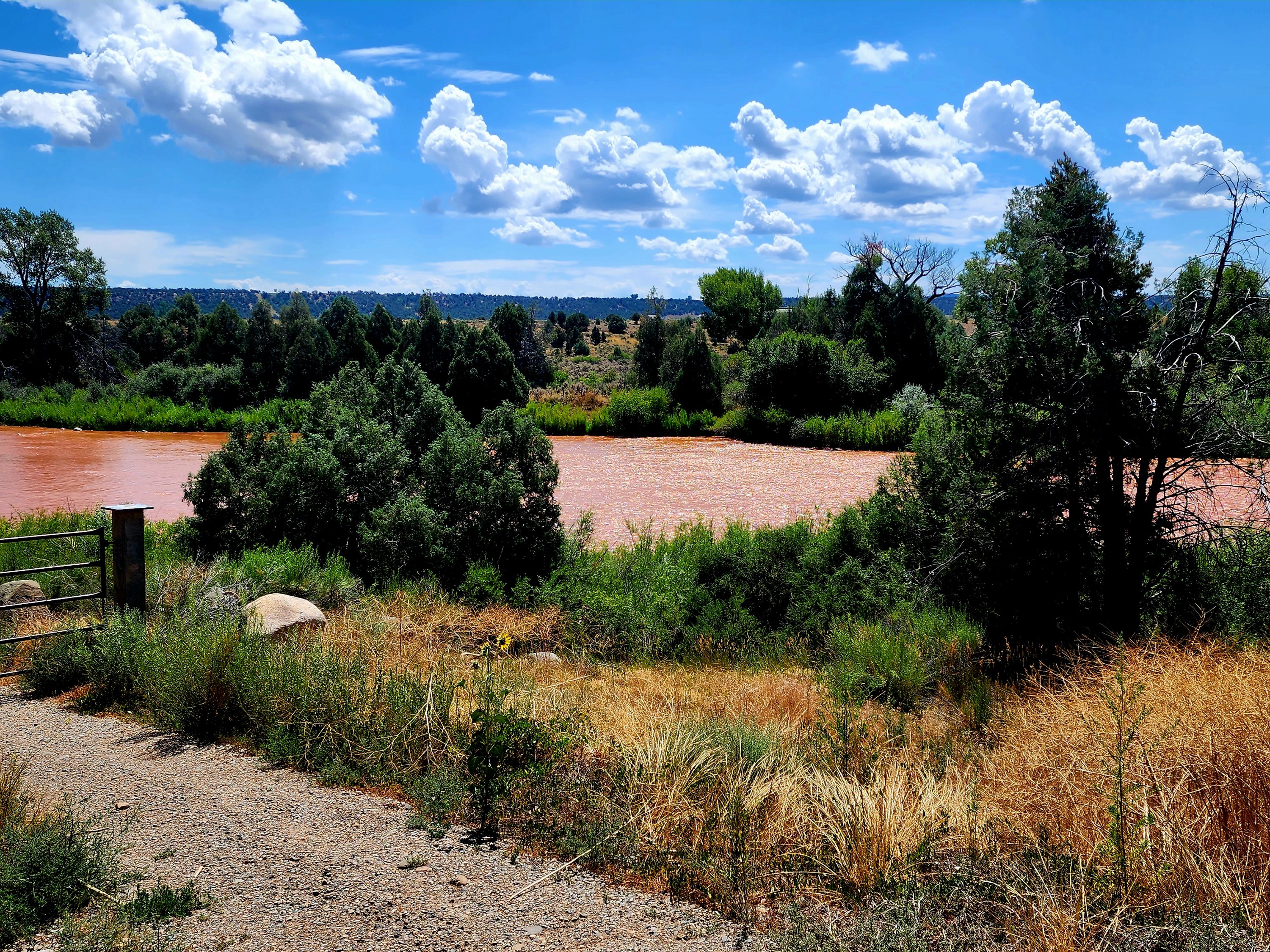 We’ve had scorching temperatures across the Southwest for at least the past month. But Sunday night a little storm blew through that produced a whopping 1/4 inch of rain for us. But evidently in the higher country they saw a sudden if brief torrential rain that brought down massive amounts of red dirt from the surrounding hills in to the Animas River. And from the looks of it you could almost say it had turned blood red.