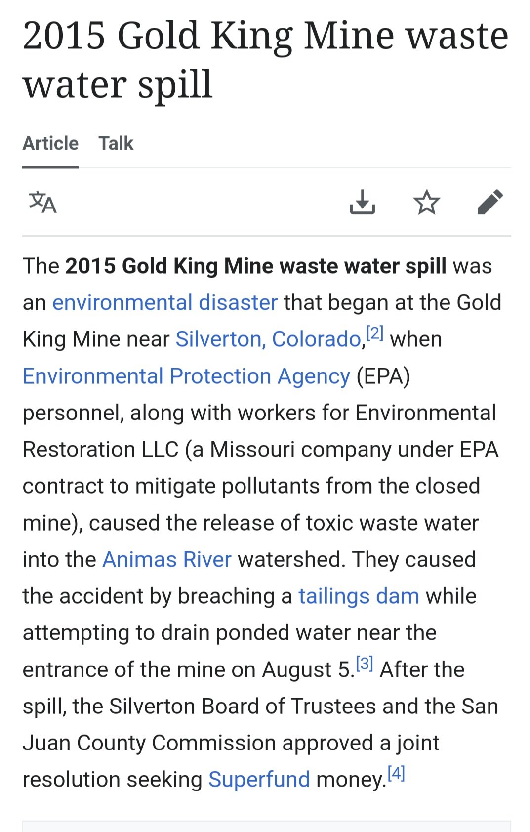 And for some reason I either missed or didn’t include the following detail – the spill was the result of an accident by the EPA who was supposed to be cleaning up the area or at least mitigating the chances of something like this happening. The incident according to Wikipedia-