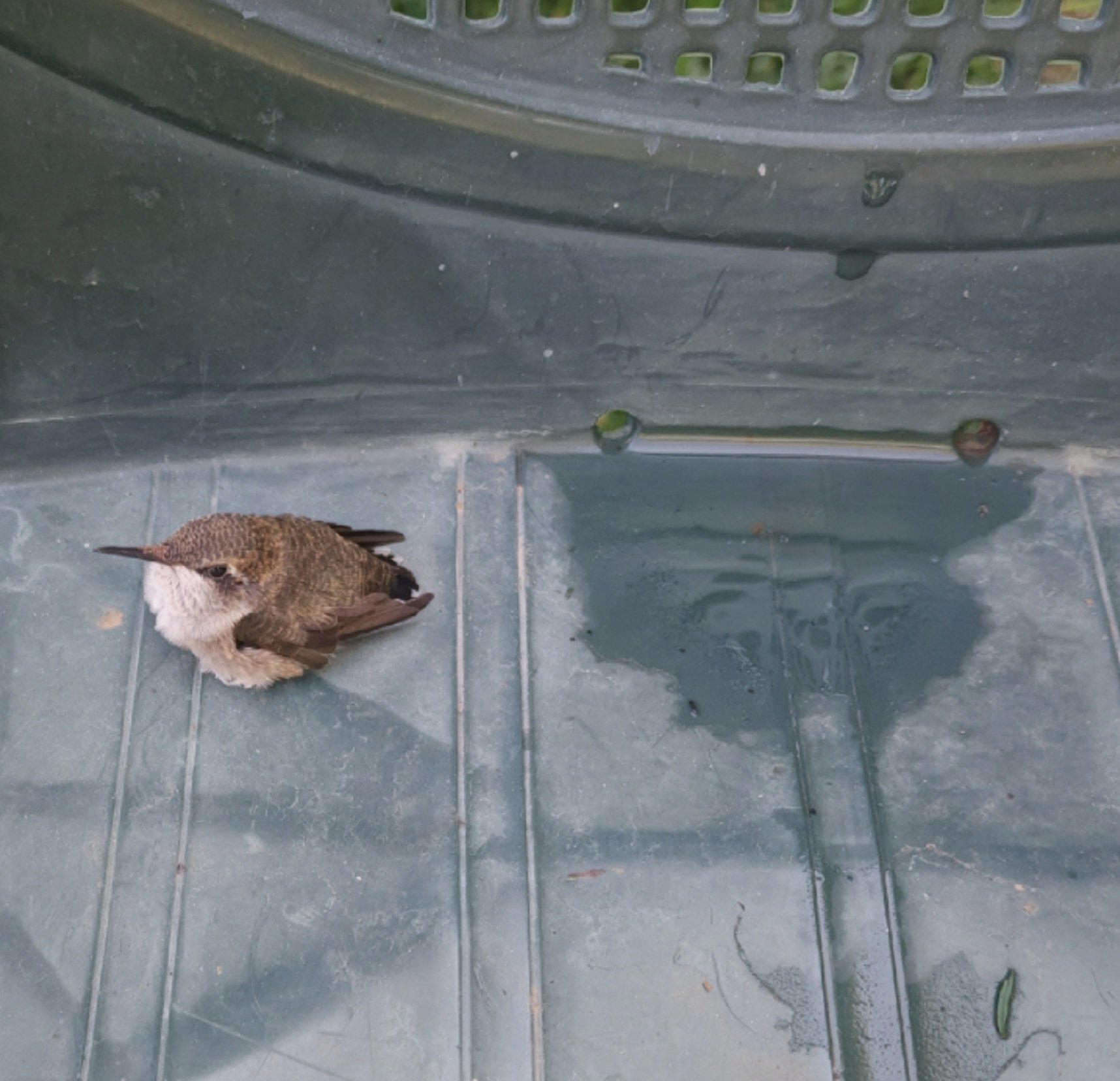 My husband suggested trying to give him some sugar water so I got a small syringe and tried dropping some on his beak. I mostly succeeded in creating a puddle of sugar water around him but he did open his beak a few times to try to get a few drops. I walked away and a few minutes later I looked and he was gone. I called to my husband to tell him that Claudio was gone – thinking the few drops of sugar water I gave him had rejuvenated him enough to fly but when my husband walked over he pointed to the grass and there he was – right next to the chair on the ground. Obviously, he had attempted to fly but didn’t make it far.