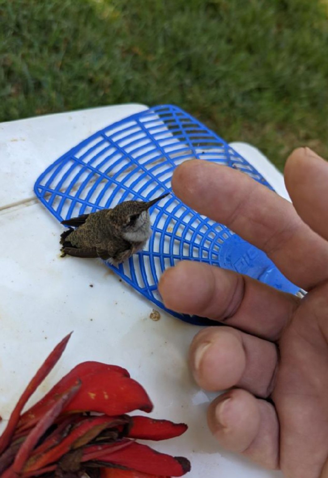 A couple of hours later I messaged my husband to see how things were going with the bird. He told me that he had moved him out of the sun using a fly swatter to lift him up. Once he had him in the shade he began to give him sugar water from the petals of a red flower but that hadn’t worked so well. So, instead he began to put the water on the tip of his finger and to his surprise little Claudio licked it all up. Every now and then he would make a high pitched squeak which brought another hummingbird (most likely the mama) swooping in at the speed of lightning making it obvious that she was not far off watching over her baby.