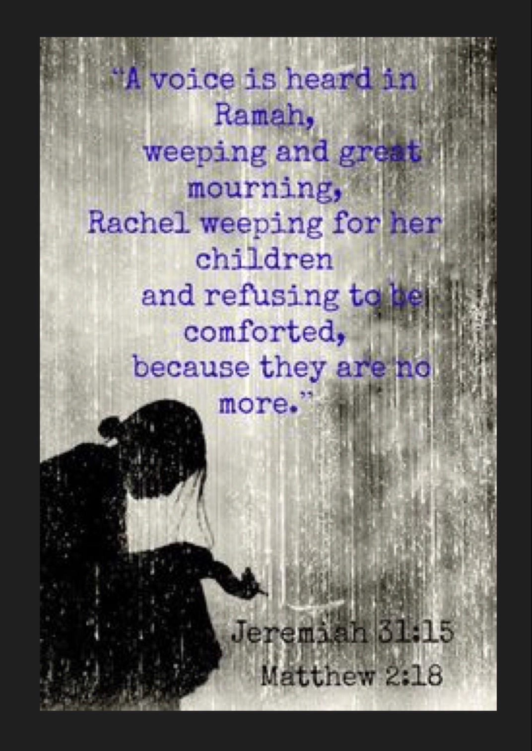 A voice is heard in Ramah, weeping and great mourning, Rachel weeping for her children and refusing to be comforted, because they are no more.” Matthew 2:18